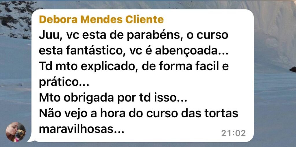 A Denise buscava um curso que tivesse ótimas receitas e um preço justo. Ela se surpreendeu com os dois! Além do valor acessível, aprendeu cremes, recheios, complementos e os famosos copos da felicidade.